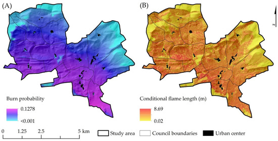 Conditional burn probability (A) and conditional flame length (B) output maps for the study area. Fires were modeled at 20-m resolution under 97th percentile fire weather conditions. The urban centers containing the bulk of residential structures are indicated with black polygons.