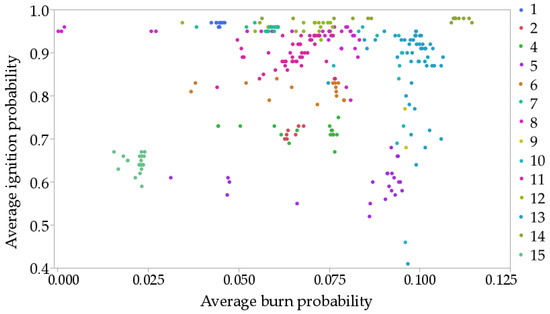Scatter plot of ignition probability (IP) versus conditional burn probability (BP) for individual residential houses (n = 306 structures). Each dot is related to a different residential house, and values correspond to the mean value in the HIZ [11]. The bubble color indicates the council cadaster polygon (Figure 1A). While BP values showed a wide distribution, most IP values were concentrated above 0.85. Overall, results tended to present clustered aggregations with respect to the council.