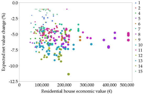 Expected economic loss for individual dwellings (eEL) ranged from a low of 740 to a high of 28,725€ within the study area (mean = 7955€), and also varied widely among the different councils (Figure 11, Table 6). The highest average values were obtained for the southern council No. 14 with 13,323€, followed by councils No. 5 and No. 10 with 12,976€ and 9715€ respectively. On the other hand, the lowest average eEL values were obtained in the low wildfire exposure northern councils No. 1 and No. 15, with 1429€ and 2803€ respectively. Overall, results depicted higher expected economic loss (eEL) for residential houses presenting lower expected net value change (eNVC), that ranged from −1.04% to −11.04%, with an average value of −5.23%. Except for a few cases, most residential houses have cadastral values between 110 and 180 thousand euros (Table 5), and therefore exposure metrics required for risk assessment translated similar patterns into risk outcomes (i.e., higher losses for higher overall exposure). Nonetheless, when the cadastral value varied substantially for the same eNVC (e.g., more than three times), wide differences were observed in terms of eEL. In those cases, the residential house cadastral value influenced the eEL result more than the eNVC (Figure 11).