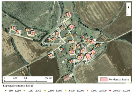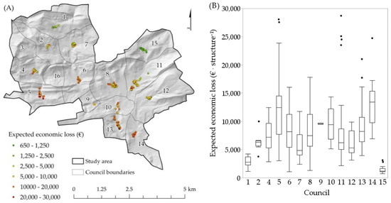 Council level summary table with expected economic loss (eEL) results for the residential houses in the Juslapeña Valley (Figure 1A). Potential expected economic loss was obtained as a result of the implementation of the framework presented in this study (Figure 2). Council polygon cadaster codes No. 3 and No. 16 do not have residential houses (Figure 1A).
