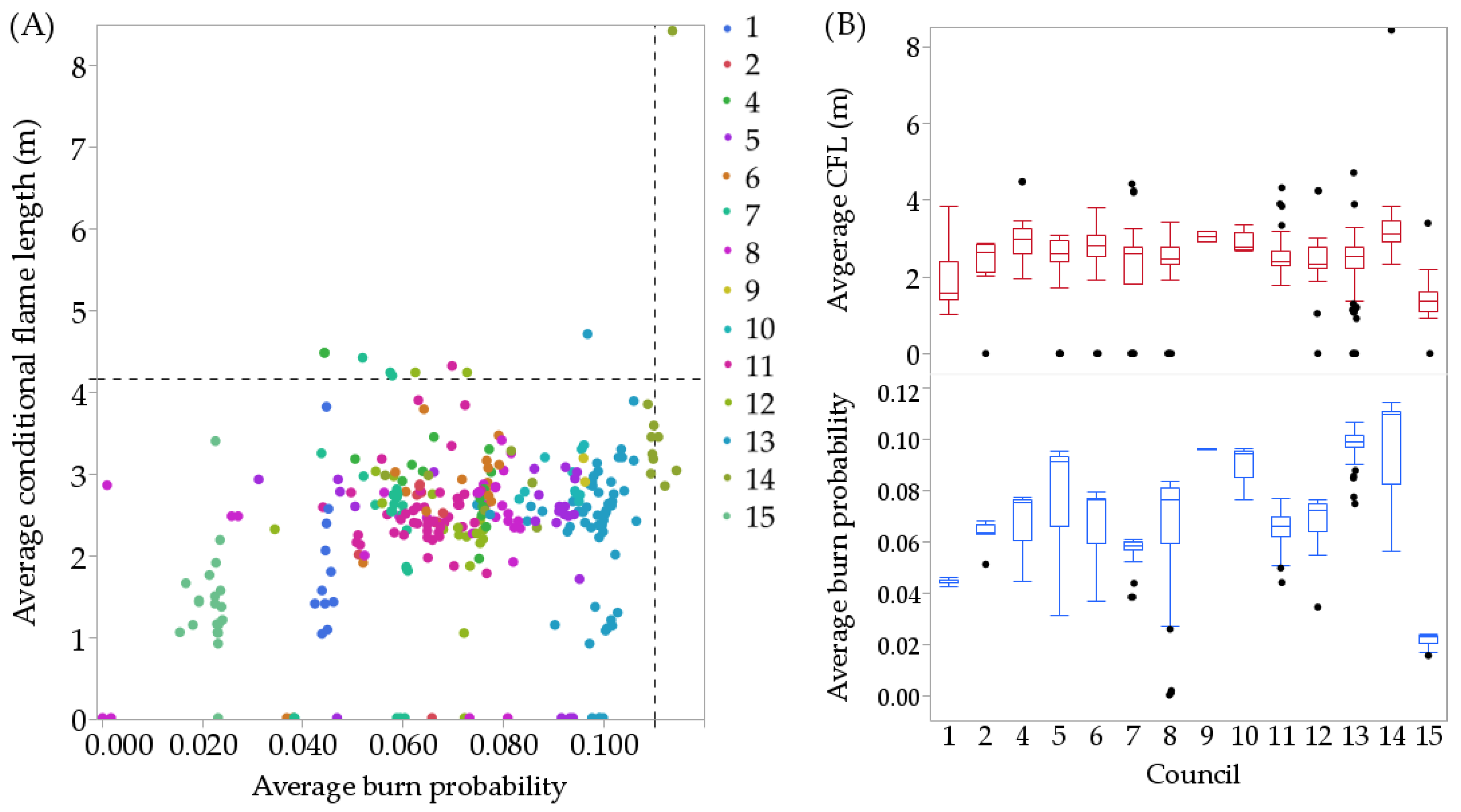 30]. Both burn probability and fire intensity in the home ignition zone (HIZ, the immediate 30–60 m-buffer area around dwellings) [