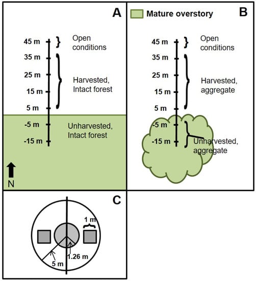 Transect design. Plots along both intact forest (A) and aggregate (B) transects extend from 15 m within intact canopy (unharvested areas indicated by negative distances) out to 45 m into harvests (positive numbers). The layout of plots centered on each sampling point along each transect is depicted in (C). There are two replicates of each transect type at each study site.