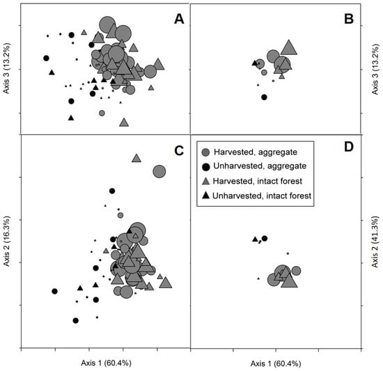 Three-dimensional NMS ordination of plots based on structural conditions. Panels (A,C) illustrate all replicate plots while panels (B,D) are the centroids for each condition. The shade indicates whether plots were located in unharvested areas under mature overstory (black) or in regenerating harvested areas (grey). Symbol shape indicates either aggregate transects (circles) or intact forest transects (triangles), while greater symbol size corresponds with increasing distance (range 5–45 m) from harvest edge. Correlations between structural components and NMS axes are provided in Table 1. Table A2 contains mixed effects ANOVA results indicating treatment effects on differences in axis scores between observed and reference plots.