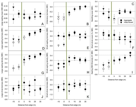 Magnitude of edge influence (MEI) on woody community structure, including all woody stems <10 cm DBH as it relates to the transition between harvested areas and two types of mature forest overstory (aggregates or intact forest, as indicated by symbol shape). Each panel (A–K) presents the MEI for a different structural attribute of regeneration and the woody understory. Observations extend from 15 m within mature canopy (−15 m) up to (+) 35 m into clearcuts. Plots at (+) 45 m served as reference conditions. Forest influence is interpreted as occurring where MEI for a particular trait differs significantly from zero (p < 0.05, indicated by hollow symbols). Solid lines at 0 m (x-axis) indicate the edge between mature canopy (aggregates or intact forest) and adjacent regenerating forest. Total woody biomass (panel D) includes above-ground stem and branch biomass for all understory woody vegetation >1 m height and with DBH < 10 cm. The legend in panel (C) applies to all panels.