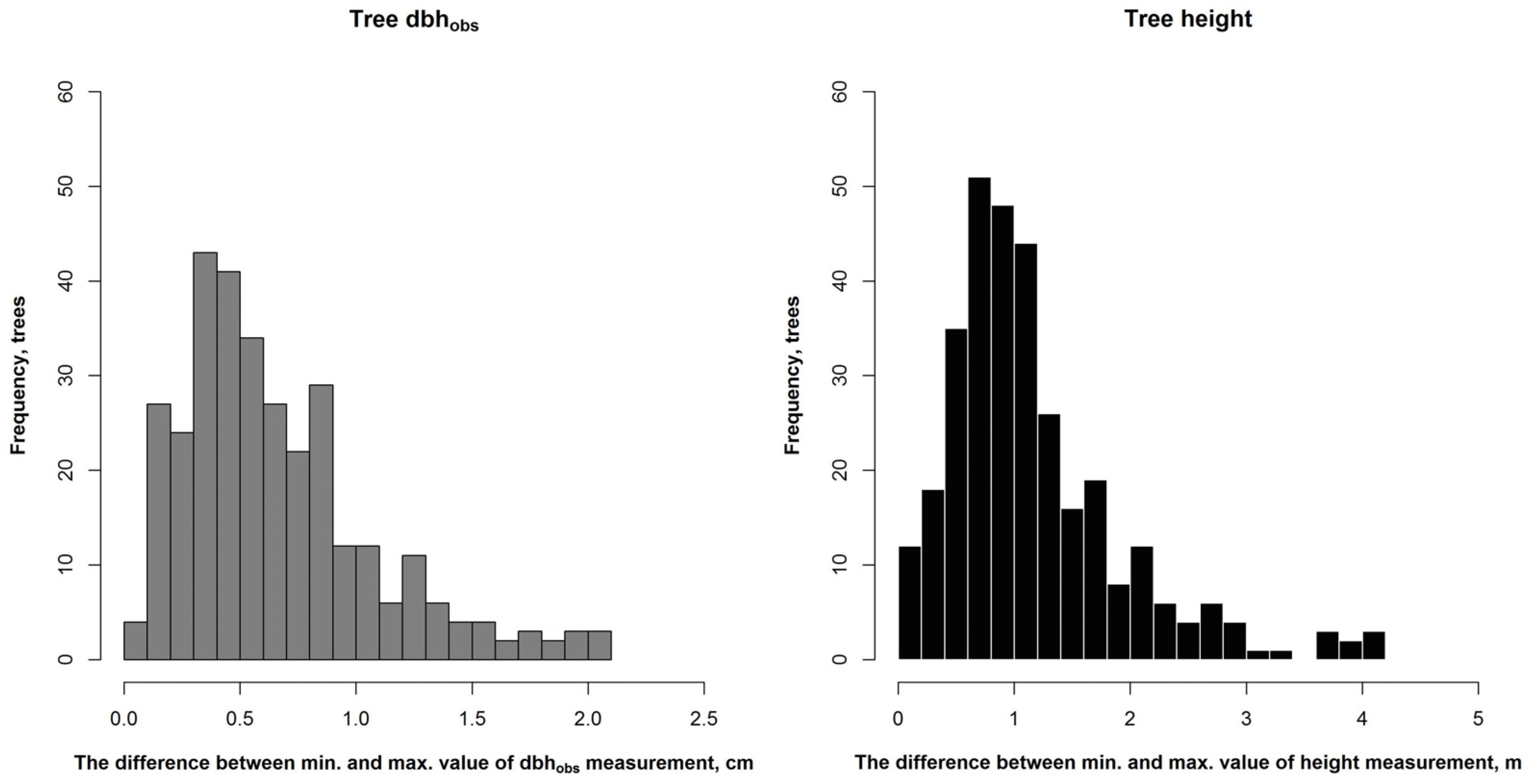 Figure 3). For 80.6% of the 319 trees measured, the range in variation remained less than 1.0 cm and for 94.0% less than 1.5 cm. For height, the difference between minimum and maximum values of the four individual measurements from the same tree was from 0.1 m to 4.2 m, respectively (