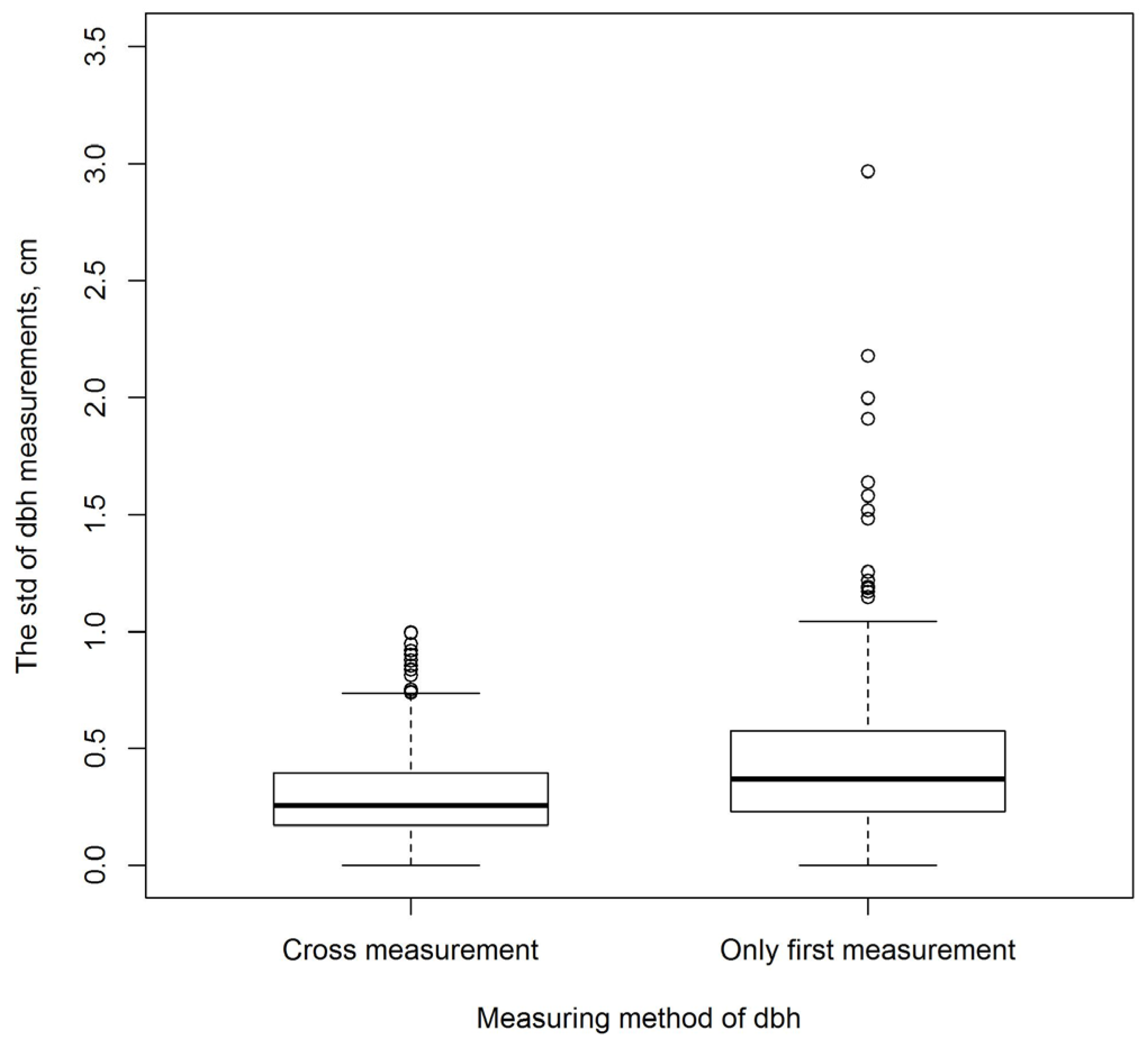 Figure 4). Likewise, the standard deviation was 0.5 cm for all tree species. The difference between the smallest and largest measured dbh value from the same tree varied from 0 cm to 6.6 cm; for 93.4% of the trees, the range of dbh measurements remained less than 2.0 cm.