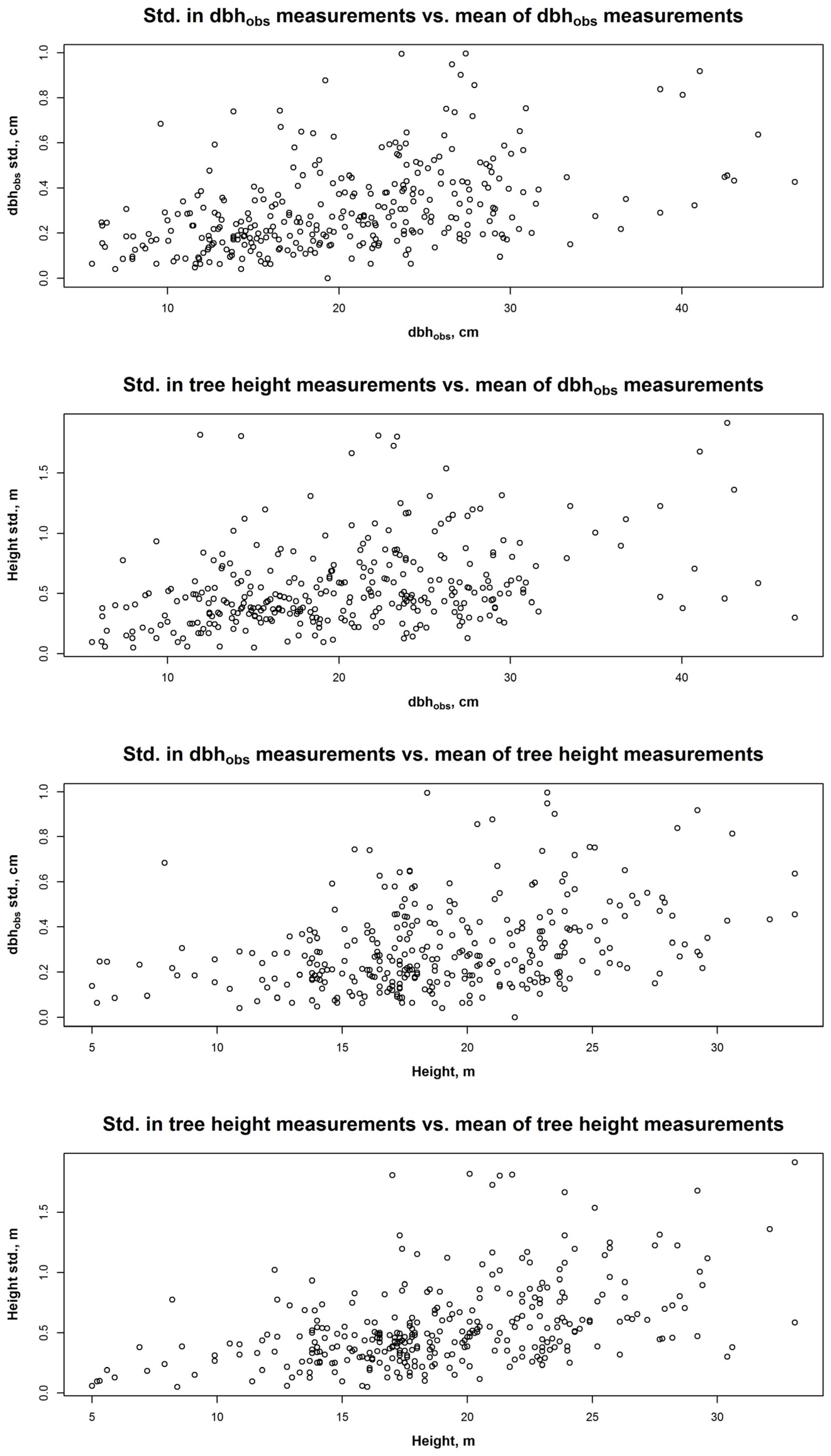 38] have also studied the precision of dbh measurements performed by several mensurationists; the standard deviation for dbh in their study was 0.69 cm (2.8%). In both of the previous studies mentioned, the number of unique trees in the data set was relatively small when compared to this study (