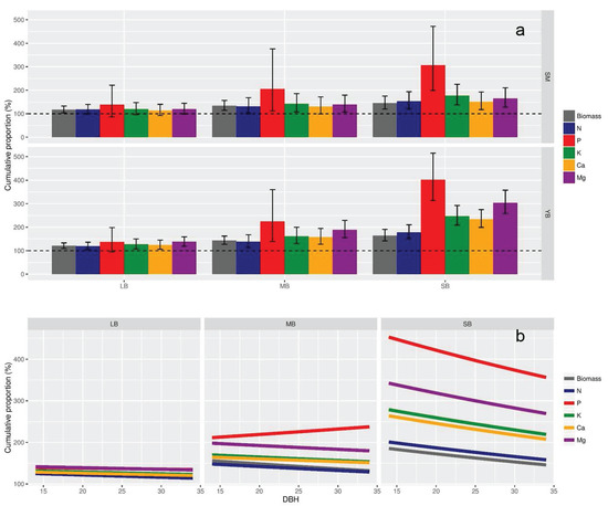 The total content of P in branch and stem compartments was more strongly correlated with its concentration (R2 = 0.64) than with the biomass of these compartments (R2 = 0.33). As a result, P was the nutrient exhibiting the greatest cumulative proportions within all branch compartments, especially small branches (300%–400%; Figure 1). High P content in tree branches has also been reported in a 70-year-old northern hardwood forest in New Hampshire [25]. Using data from this last study to compute the cumulative proportion of P in the whole tree (i.e., the ratio of WTH/SOH P export) yielded a value of 280% (see Table S3). Similarly, a review for Canadian tree species reported average P concentrations in branches that were two to three times greater than in stem bark [8].