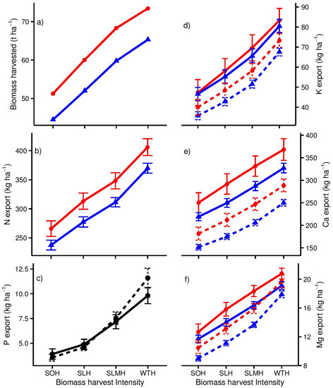 Average mass per unit area (kg·ha−1) of exported biomass and nutrients as a function of biomass harvest intensity, stand composition, and tree marking procedure. Only variables explaining more than 1% in the variation of nutrient export are presented in this figure. Red lines correspond to diameter-limit cutting, blue lines represent selective cutting, solid lines are for pure sugar maple stands, and dashed lines correspond to mixed sugar maple-yellow birch stands. The black line for P correspond to the values averaged over both tree marking procedure. SOH = stem only harvesting, SLH = stem + large branch harvesting, SLMH = stem, large + medium branch harvesting, WTH = whole tree harvesting. Error bars correspond to standard deviations.