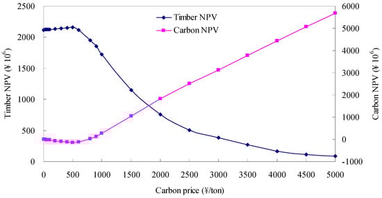 Based on a broad survey of the forestry literature, one can state that numerous variables affect forest management decision making (e.g., forest characteristics, management policies and economic factors). Of these variables, economic factors might be one of the clearest and most credible bases for forest management practices. Today, long-term carbon trading or carbon taxes have been implemented in many countries. However, carbon prices vary from region to region and country to country [27]. For example, the carbon prices in countries that have adopted carbon trading are typically less than 100 ¥/ton (1¥≈0.16$; e.g., Europe: 31 ¥/ton, China: 50 ¥/ton, New Zealand: 81 ¥/ton). In contrast, the carbon prices in countries that employ carbon taxes are approximately 1000 ¥/ton (e.g., Sweden: 818 ¥/ton). Therefore, the quantitative assessment of the effects of carbon prices on decision making is an important prerequisite when a forest planning model is applied in practice.