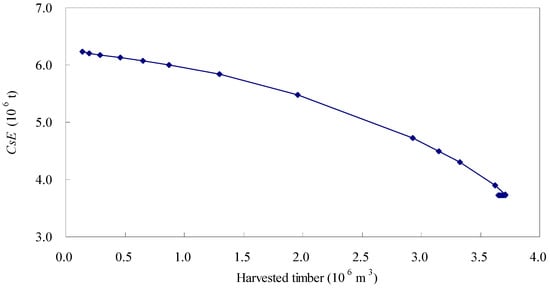 Trade-offs between harvested timber and the CsE for a 30-year time frame when carbon prices varied from zero to 5000 ¥/ton, where CsE represents the levels of carbon stocks in living tree biomass at the end of the planning horizon.