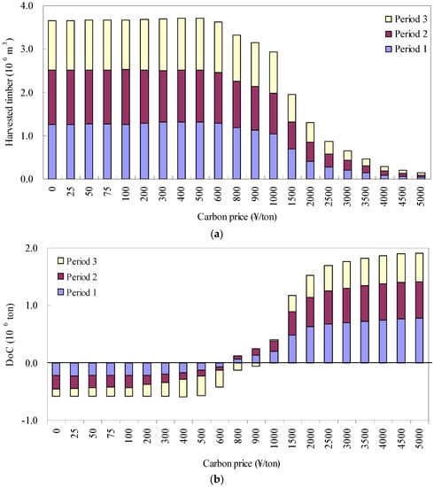 Levels of harvested timber (a) and the DoC (b) for each time period when carbon prices varied from zero to 5000 ¥/ton, where DoC represents the differences of carbon stocks in living tree biomass between the beginning and end of the planning horizon.