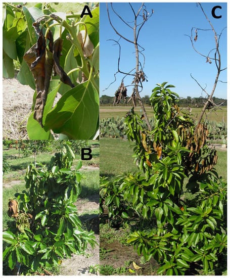 Laurel wilt has affected avocado in Florida for at least a decade, but so far only ca. 3% of the avocado trees in commercial production have been killed []. However, the short time laurel wilt has been in South Florida (where most commercial production occurs), the great susceptibility of avocado to this disease, and experience with other lethal, invasive diseases [,] suggests that laurel wilt will, in the future, cause increasing damage on avocado in Florida. Laurel wilt imperils avocado production in other states (e.g., California and Hawaii), USA protectorates (Puerto Rico) and neighboring countries such as Mexico [].