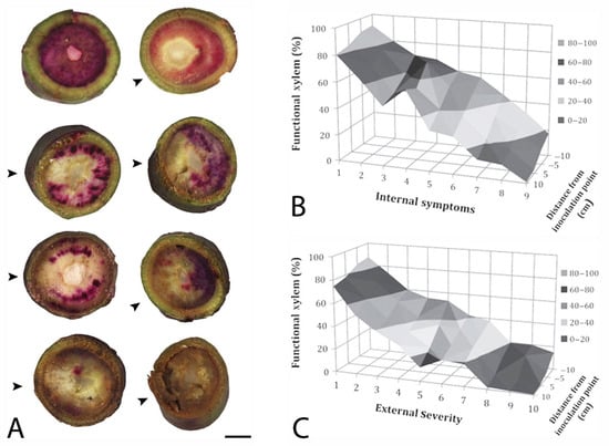 “Simmonds” avocado trees were inoculated with Raffaelea lauricola and xylem function was assessed with an acid fuchsin stain []. In (A), burgundy to pink staining in stem sections indicates functional xylem, which was quantified in scanned, digital images. From left to right and top to bottom, xylem in cross sections are: 98% functional (water control, internal symptoms (is) = 1; 86% (3 days after inoculation (dai)), is = 1; 76% (7 dai, is = 2); 71% (14 dai, is = 3); 32% (21 dai, is = 5); 30% (21 dai, is = 6; 5% (42 dai, is = 9; and 1% (42 dai, is = 9). Arrows (^) indicate the position on a stem that was inoculated, and the scale bar = 0.5 cm. In the response surfaces, % of functional xylem is graphed on the y-axes against the distance from the inoculation point on the z-axes and (B) internal and (C) external symptom development on the x-axes, which was rated on a 1–10 scale, where 1 = healthy, no symptoms, and 10 = dead, totally symptomatic.