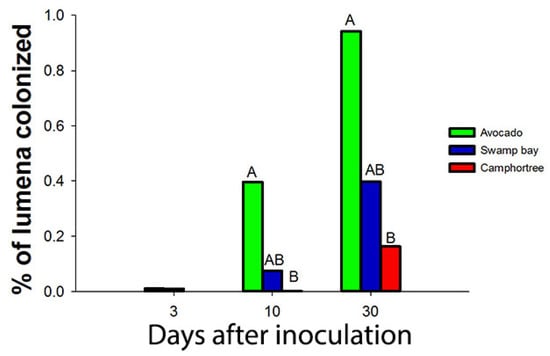Campbell et al. [] observed that less than 1% of the lumena of avocado, swamp bay and camphortree were colonized with a GFP-labelled strain of Raffaelea lauricola, even 30 days after inoculation (dai) (when most plants of avocado and swamp bay had died from laurel wilt).