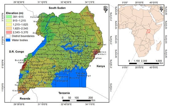 Uganda is located in the tropical zone of East Africa, between latitudes 4°12′ N and 1°29′ S and longitudes 29°34′ W, and 35°0′ E. The country shares borders with South Sudan in the north, Rwanda and Tanzania in the south, Kenya in the east and the Democratic Republic of Congo in the west. Its elevation ranges from 391 m to 5370 m. Uganda has a surface area of about 243,593.30 km2 (Figure 1). More than two-thirds of the country’s surface area is a plateau, lying between 1000 and 2500 m above sea level. Precipitation is reliable, varying from 750 mm in Karamoja in the Northeast to 1500 mm in the high rainfall areas on the shores of Lake Victoria, in the highlands around Mount Elgon in the east. Temperatures in the Rwenzori mountains in the southwest and some parts of Masindi and Gulu districts range from 15 to 30 °C with a mean of 21 °C [23]. In 2015 Uganda’s population was estimated at 41 million in 2015 with a 16.1% urban population [19].