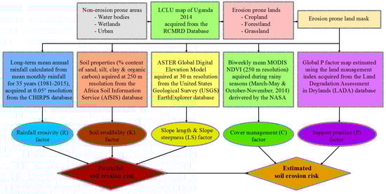 The updated administrative boundaries of Uganda utilized in this study were provided by the Energy sector GIS working group in Uganda [24]. Figure 2 presents the flowchart used for modeling the soil erosion risk by water in Uganda.