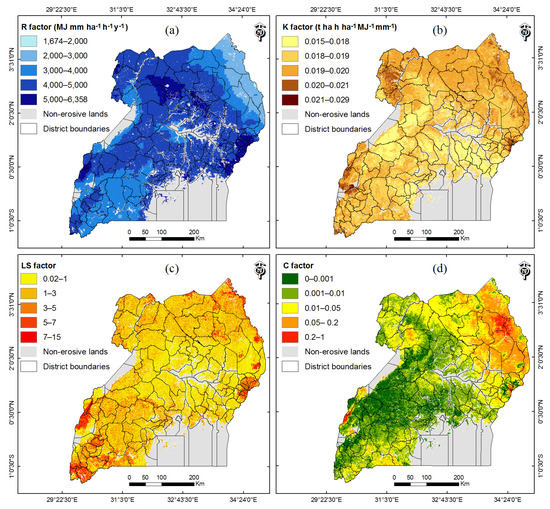 The K factor expresses the susceptibility of soil erodibility due to its soil properties [37,38]. Soil erodibility factor of Uganda (Figure 4b) was estimated based on the sand, clay, silt and organic carbon fractions compiled by the Africa Soil Information Service (AfSIS) [39] using Equation (3) proposed by Williams (1995) [38,40,41].