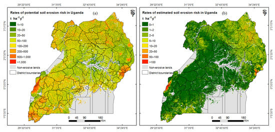 Maps of the soil erosion risk by water in the whole erosion-prone area (194,902.61 km2) of Uganda in 2014: (a) potential soil erosion risk and (b) estimated soil erosion risk.