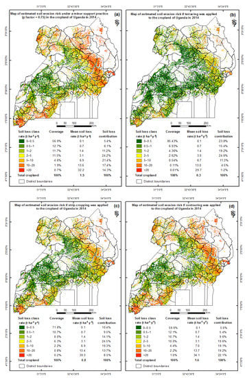 Maps of the estimated soil loss risk for Uganda’s croplands (86,341.86 km2) under different support practices: (a) minor conservation in 2014 (P = 0.75); (b) terracing; (c) strip-cropping; and (d) contouring.