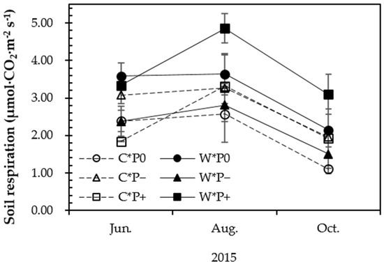 Variations in soil respiration among treatments. Vertical bars indicate the standard error. Treatments: C*P0 = atmospheric temperature control and precipitation control; W*P0 = atmospheric warming and precipitation control; C*P− = atmospheric temperature control and reduced precipitation; W*P− = atmospheric warming and reduced precipitation; C*P+ = atmospheric temperature control and elevated precipitation; and W*P+ = atmospheric warming and elevated precipitation.
