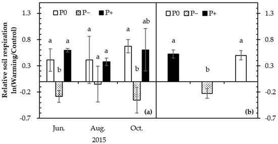 (a) Variations in relative soil respiration between the warmed plots and non-warmed plots subjected to three precipitation manipulations; (b) mean relative soil respiration between the warmed plots and non-warmed plots under different precipitation manipulations. Vertical bars indicate the standard error. Different lower-case letters represent significant differences (p < 0.05). Treatments: P0 = precipitation control; P− = reduced precipitation; P+ = elevated precipitation.