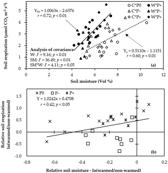 (a) Soil respiration plotted against soil moisture in warmed plots (YW) and non-warmed plots (YC); (b) relative soil respiration between warmed and non-warmed plots plotted against relative soil moisture between the warmed plots and non-warmed plots. Treatments: P0 = precipitation control; P− = reduced precipitation; P+ = elevated precipitation; C*P0 = atmospheric temperature control and precipitation control; W*P0 = atmospheric warming and precipitation control; C*P− = atmospheric temperature control and reduced precipitation; W*P− = atmospheric warming and reduced precipitation; C*P+ = atmospheric temperature control and elevated precipitation; and W*P+ = atmospheric warming and elevated precipitation.