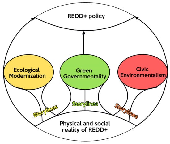 Schematic representation of storylines and discourses on REDD+ policy. (Source: Authors’ own illustration). The colored yellow, green, and red circles in Figure 1 represent different discourses. The threads underneath the circles represent the different contributing storylines that actors develop to support certain discourses, based on their physical and social realities.