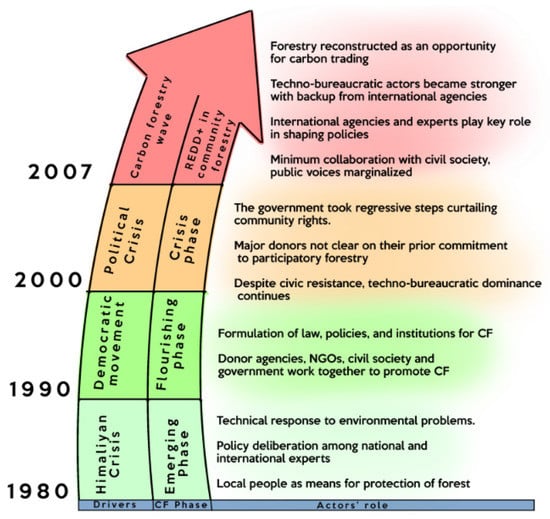 Nepal’s forest policy and its actors have been shaped through global political and environmental waves, as well as national events [,,,]. Specifically, stories of Himalayan degradation in the 1970s, the structural adjustments of the 1980s, and carbon forestry efforts after 2007 constituted major global waves that affected forest policies and (re)shaped the political landscape of Nepal’s forest governance. In addition, major political changes in the country and learning from experience have also been reflected in Nepal’s forest policy development and in defining actors’ roles in the deliberation process. Figure 2 (see below) gives a broad overview about global and national drivers that affected Nepal’s forest policies and its actors throughout different phases of forest governance. The evolutionary process is roughly simplified here and depicted as a linear pathway, but in practice these processes were interconnected and overlapped in complex ways [].
