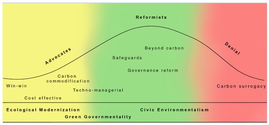 Current international debates about climate change are shaped by different and often conflicting but also partly overlapping environmental discourses []. Authors such as Dryzek, Hoffman, Bäckstrand and Lövbrand and Grist [,,,,] have traced how discourses of sustainability, neoliberalism, and ecological modernization have emerged, arguing that these discourses have come to structure global environmental governance. Dryzek [] identifies seven discourses of environmentalism (survivalism, promethean response, administrative rationalism, democratic pragmatism, economic rationalism, sustainable development and ecological modernization). Hoffman [] offers science-oriented discourses, specifically “skeptical”, “convinced” and “bridge-building” as a typology. Bäckstrand and Lövbrand [,] identify three meta-discourses to solve climate-related problems: “green governmentality” that focuses on expert-driven reform at a multi-lateral level; “eco-modernization” that focuses on market-driven reform with economic rationality, and “civic environmentalism” that focuses on people-driven reform which is subdivided into two versions (reformist and radical) relying on the third sector rather than on markets or states to tackle climate change.
