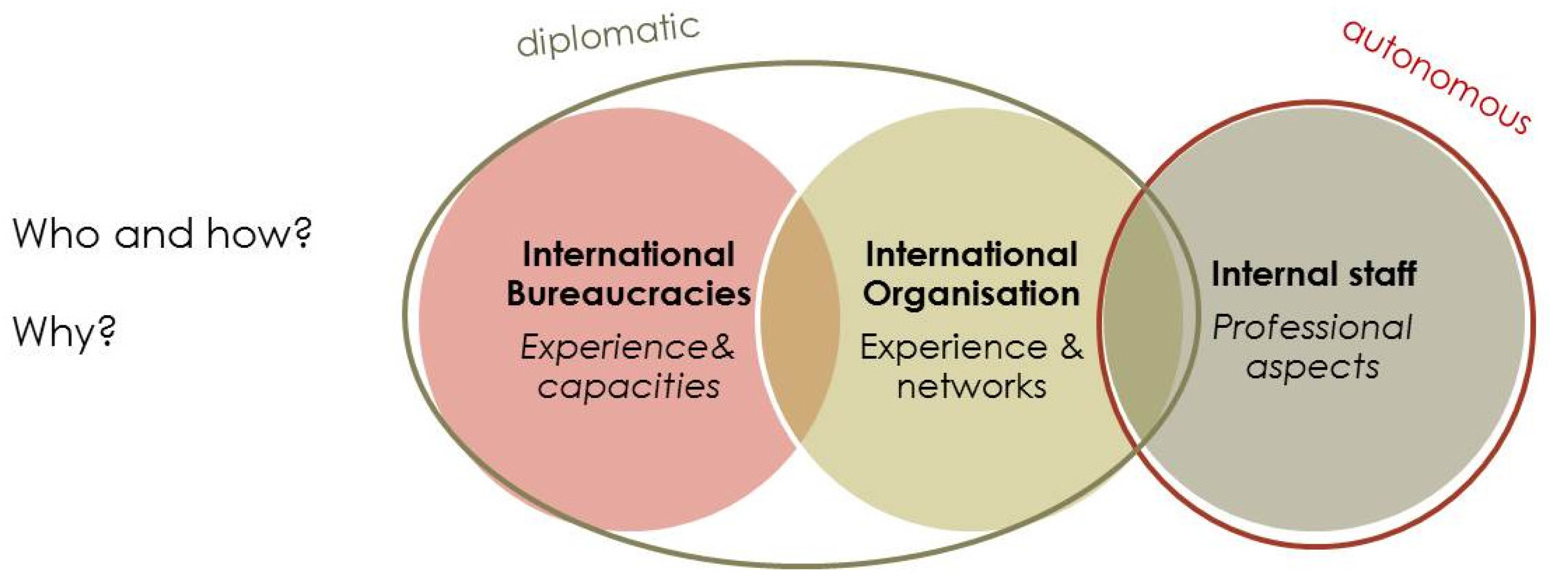 An important rationale for relying on (typically rather expensive and unwieldy) international bureaucracies (type 1) or international organizations (type 2) is that the respective actors are highly experienced in working professionally in diplomatic settings and possess specialized financial and organizational capacities or relevant networks for facilitating delicate policy processes with state representatives. Noteworthy to say, the cases of SCF and the REDD+ Partnership (type 1) are also more or less formally and directly oriented at and relating to ongoing international REDD+ negotiations. By contrast, such aspects appear to matter less in cases such as the Gold Standard or the Green Belt Movement, which mainly draw on their own (internal) staff. Overall, this administrative role seems to be more autonomous or independent from outside expectations and driven mainly by internal working requirements. The influence of internal staff secretariats (type 3) on relevant IO and UN networks or respective ongoing negotiations is formally much weaker than in cases of type 1 and 2 secretariats (such as the Bonn Challenge, PMR or SCF), where the same people physically take part in different settings. Figure 1 covers the spectrum of different administrative roles as identified in the eight forest climate governance cases. As mentioned earlier, each of the three smaller circles represents one role type (here: International Bureaucracies, International Organizations, Internal Staff) and the outer circles reflect the underlying (common) rationale (e.g., diplomatic vs. autonomous).