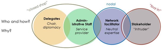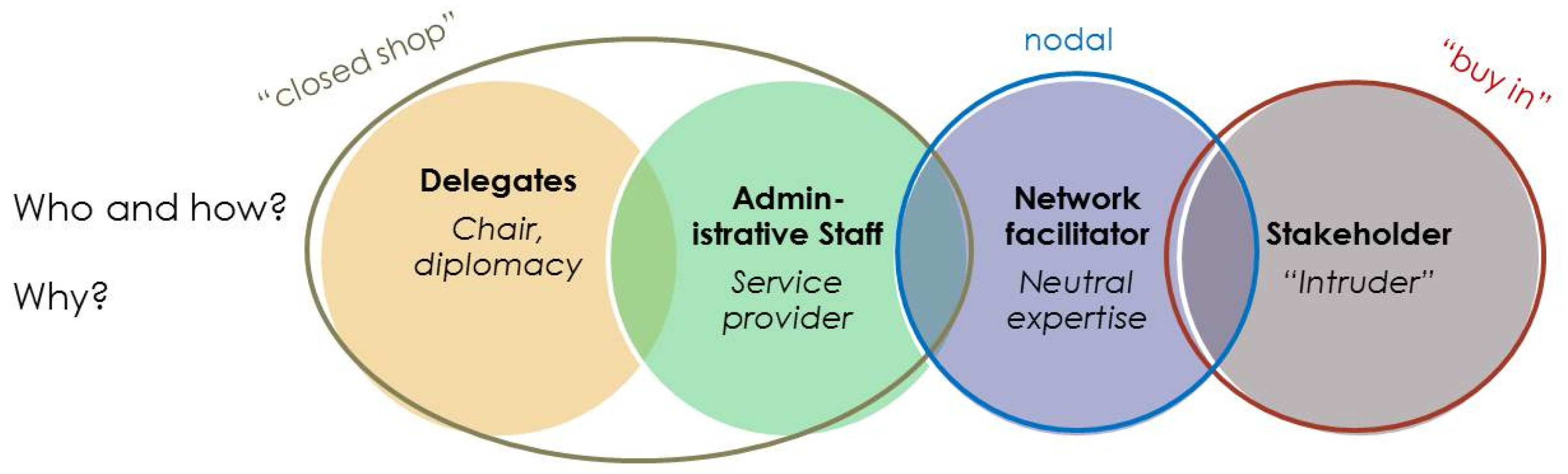 Operational decision-making appears to resemble administrative roles in terms of the day-to-day work they engage in, for instance as chairs of meetings that are concerned with the daily procedural decisions about how, when, and where to meet and what topics to set on the agenda. These seem like relatively harmless activities at first sight; but since such decisions, in fact, restrict certain (alternative) topics from being set on the agenda as much as they exclude certain stakeholders from contributing to decisions, this role is potentially highly authoritative. We identified four types of operational roles: (1) delegates, (2) administrative staff, (3) network facilitator and (4) stakeholders; these are visualized in Figure 2. Subtypes represented in the “bubbles” reflect the reasons for why a specific role was employed, in this case especially regarding expectations about professional skills. Moreover, we identified three common or distinct rationales tied to different operational decision subtypes: “closed shop”, “nodal” or “buy in”.