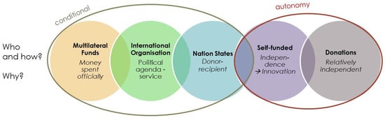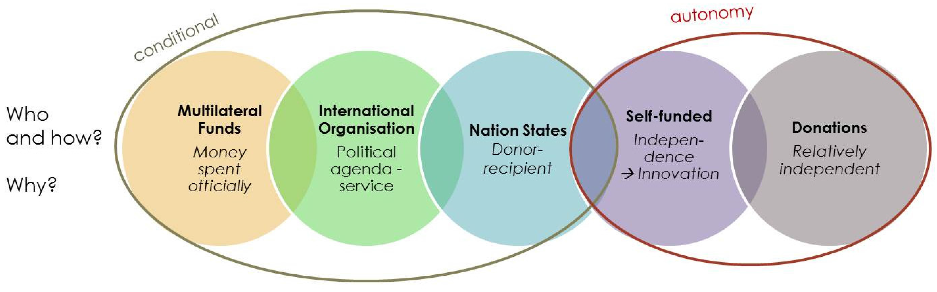 In the eight cases, we identified five different types of finance coming either from (1) multilateral funds, (2) international organizations, (3) nation states, (4) own funds, or (5) donations, each representing different accountability communities. Figure 3 gives an overview of the spectrum of different financial roles in terms of who provides the funding. The two wider circles illustrate how the funding relationship affects the work of the governance setting and how the role affects the possibilities to spend the money; either conditionally or autonomously. The words in italics below refer to the question of why these roles exist and what kind of relationship and what expectations are bound to them.