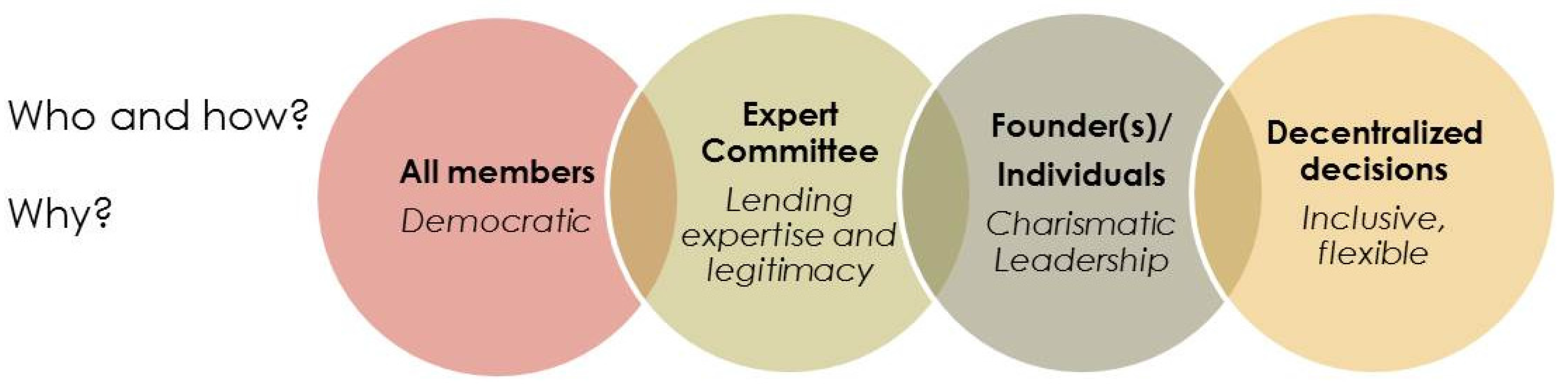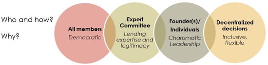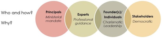 While the role of principals (type 1) is based on ministerial mandates, e.g., high-level public servant, experts (type 2) are elected or nominated because of the professional guidance they are expected to provide, e.g., in their role as technical advisory board members. Founders or individuals (type 3) carry their strategically important role due to their charismatic leadership. Lastly, stakeholders (type 4) themselves may take strategic decisions, e.g., in plenary discussion, mostly for the sake of ensuring that these decisions that concern everybody in the setting are democratic.