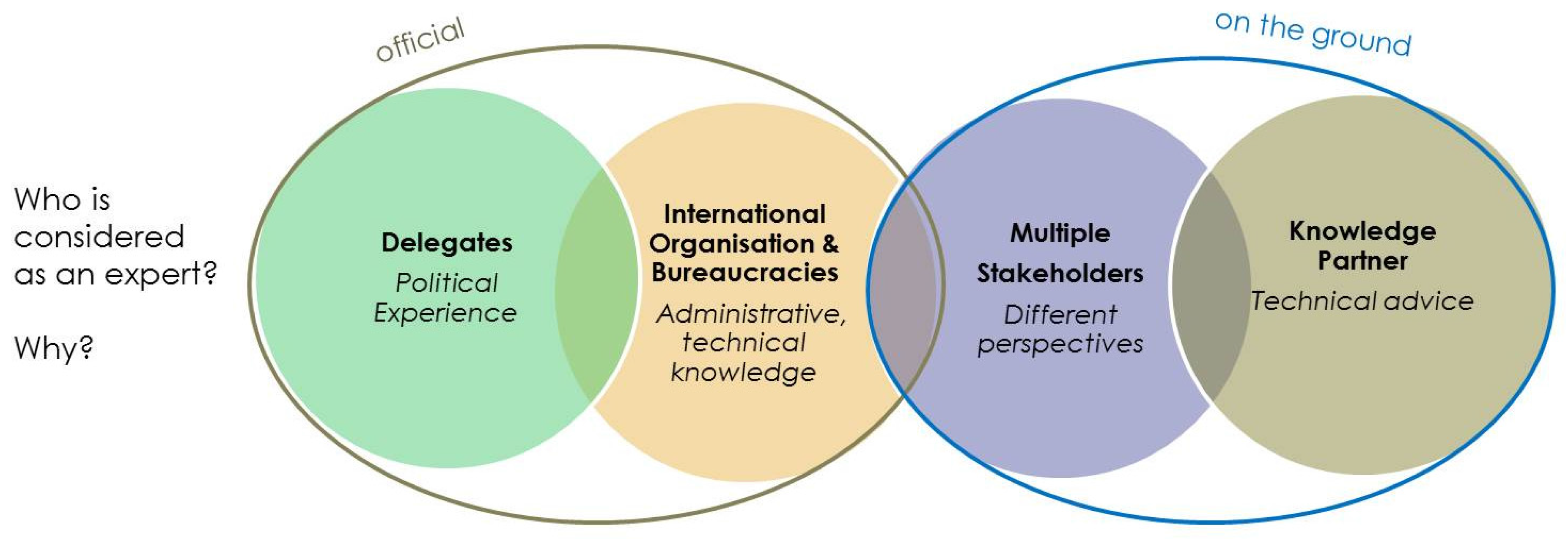 Figure 6 displays the broader spectrum of different types of expert roles, visualizing (in bold) who is considered an expert and the respective qualitative features tied to these roles (outer circles). Accordingly, actors may be considered as experts based on their political experience (in italics, type 1), administrative (type 2) technical knowledge (type 2 and 4) or based on the different perspectives they bring (type 3).