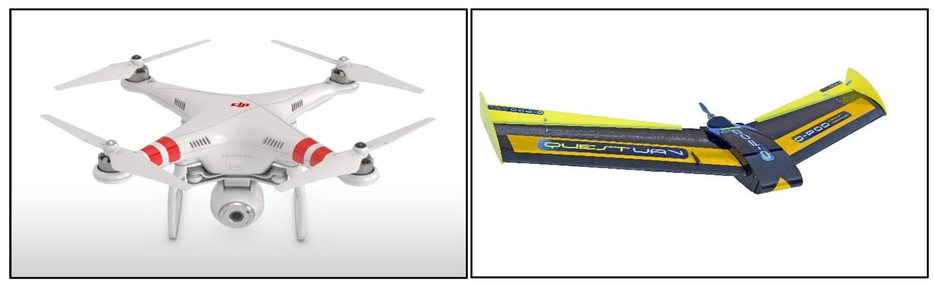 DJI Phantom 2 quadcopter UAV (left) and a Quest Q-Pod fixed-wing UAV (right). UAVs of this size with <20 kg mass and <4 m wingspan are classified as ‘small’ UAVs [24]. (Photographs adapted from [25,26]).