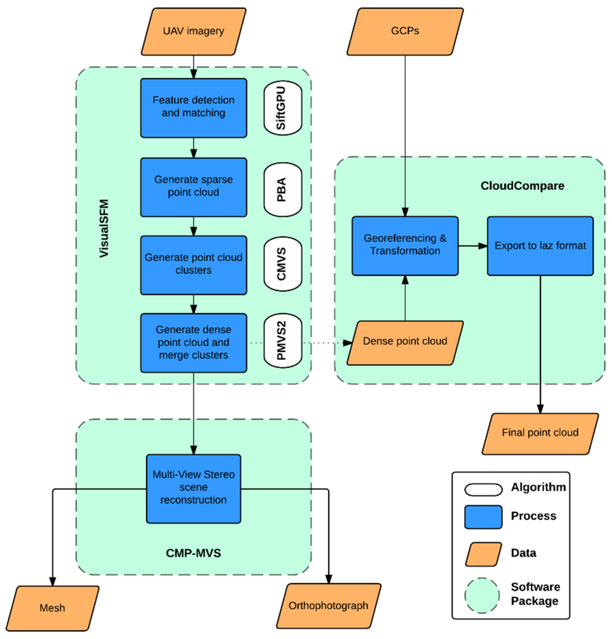 SfM and MVS workflow in VisualSFM, CMP-MVS and CloudCompare. Four different algorithms are executed in VisualSFM to generate a dense point cloud.