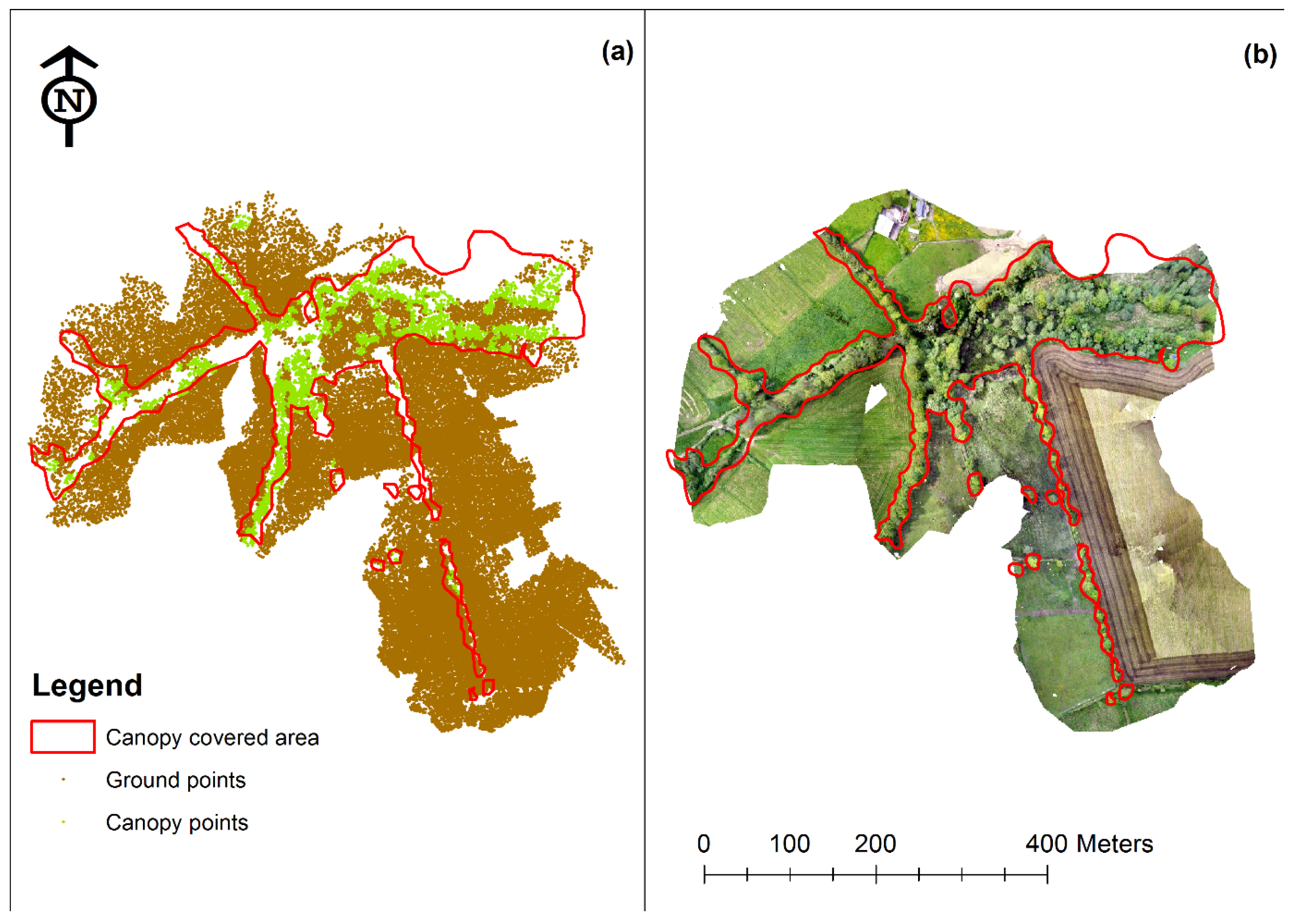 Showing (a) Classified SfM point cloud from and (b) Ortho-photograph at the Meshaw site. Ground points are shown in brown while canopy points are shown in green.