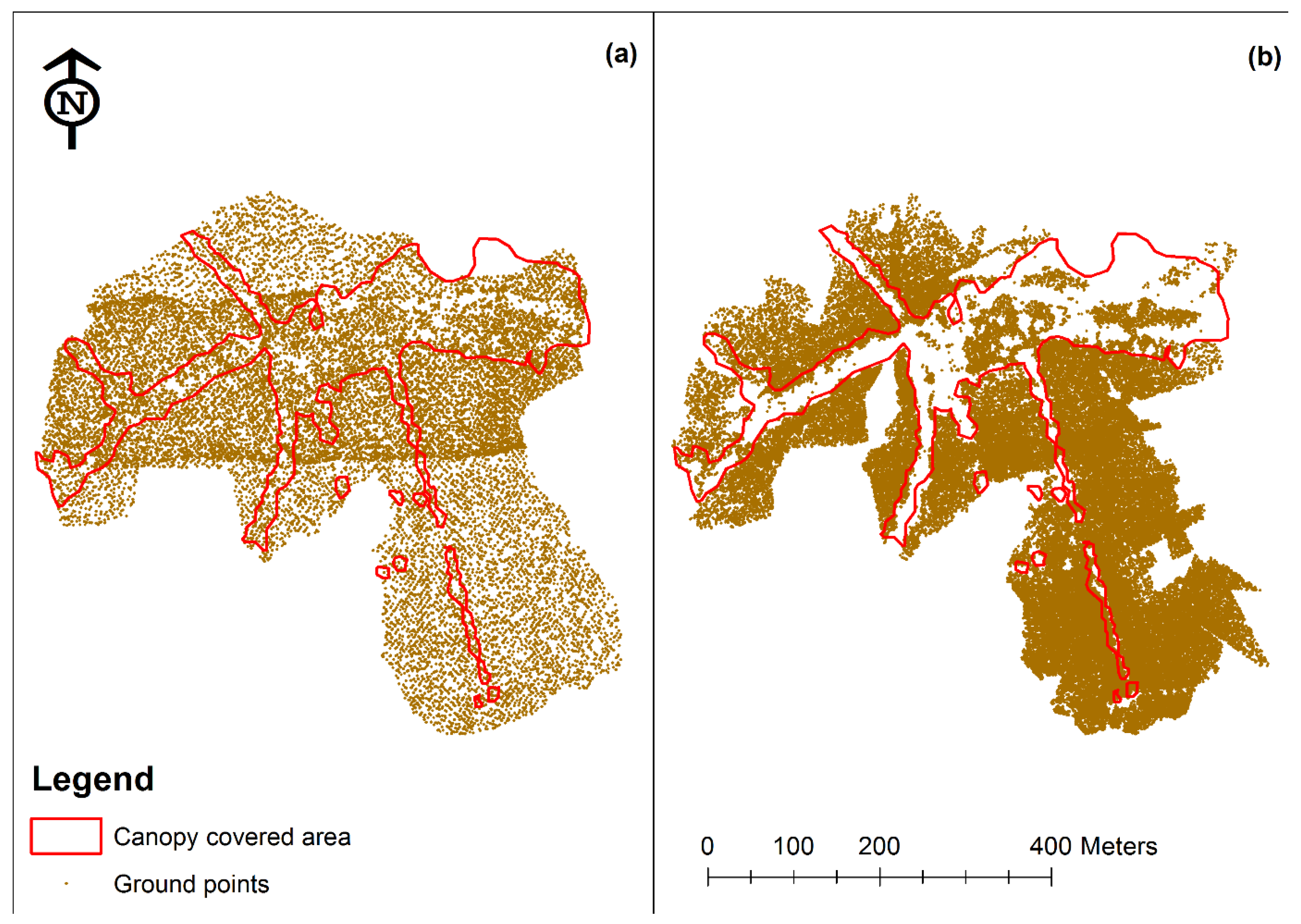 Showing (a) LiDAR ground points and (b) SfM ground points at the Meshaw site. Point density in canopy areas was 0.27 points/m2 for LiDAR and 1.56 points/m2 for SfM.