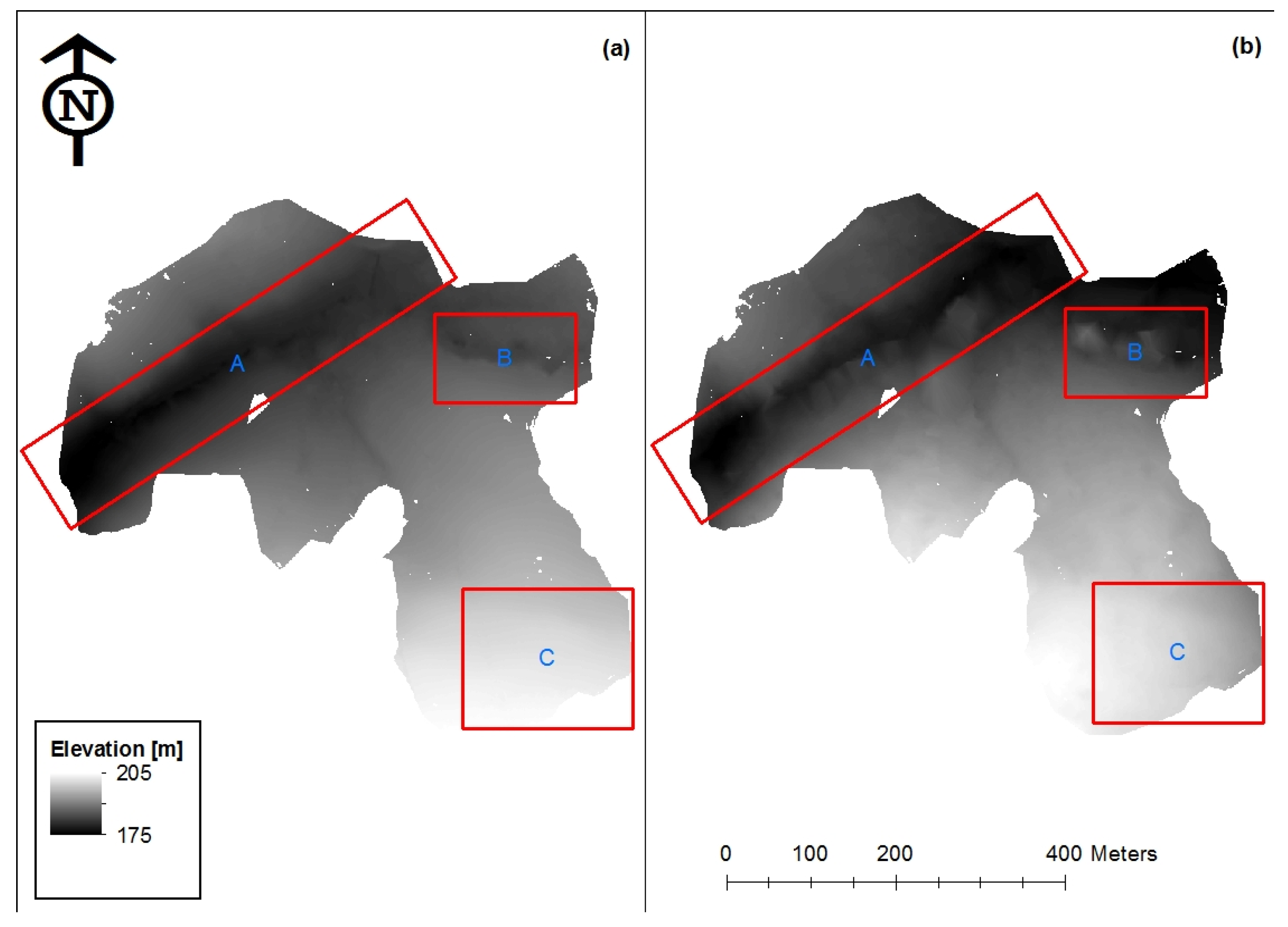 Showing (a) LiDAR DEM and (b) SfM DEM generated from the respective ground classified points at the Meshaw site. Boxes A and B show areas where the LiDAR had lower elevation than SfM, while in box C, LiDAR had higher elevation than SfM.