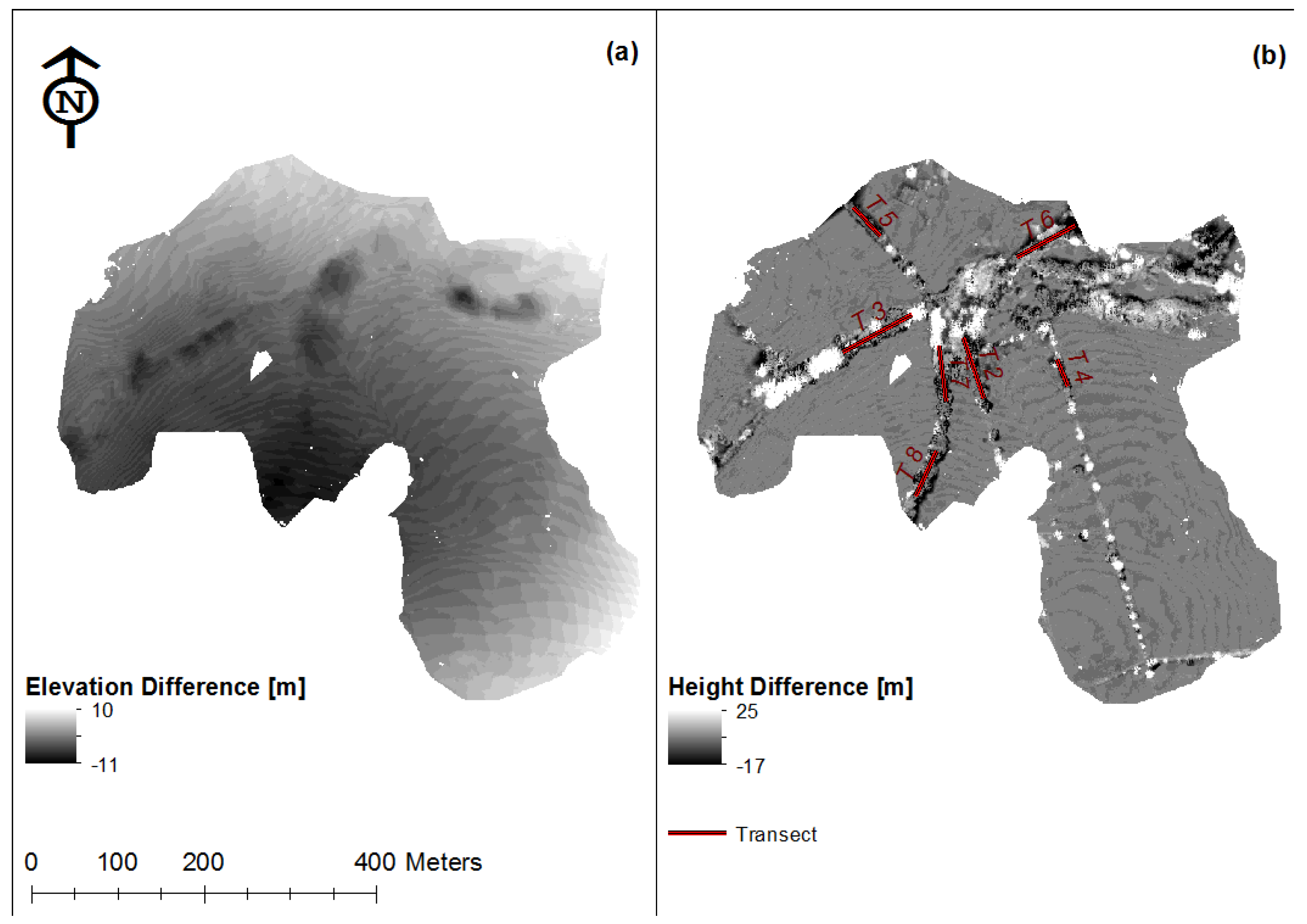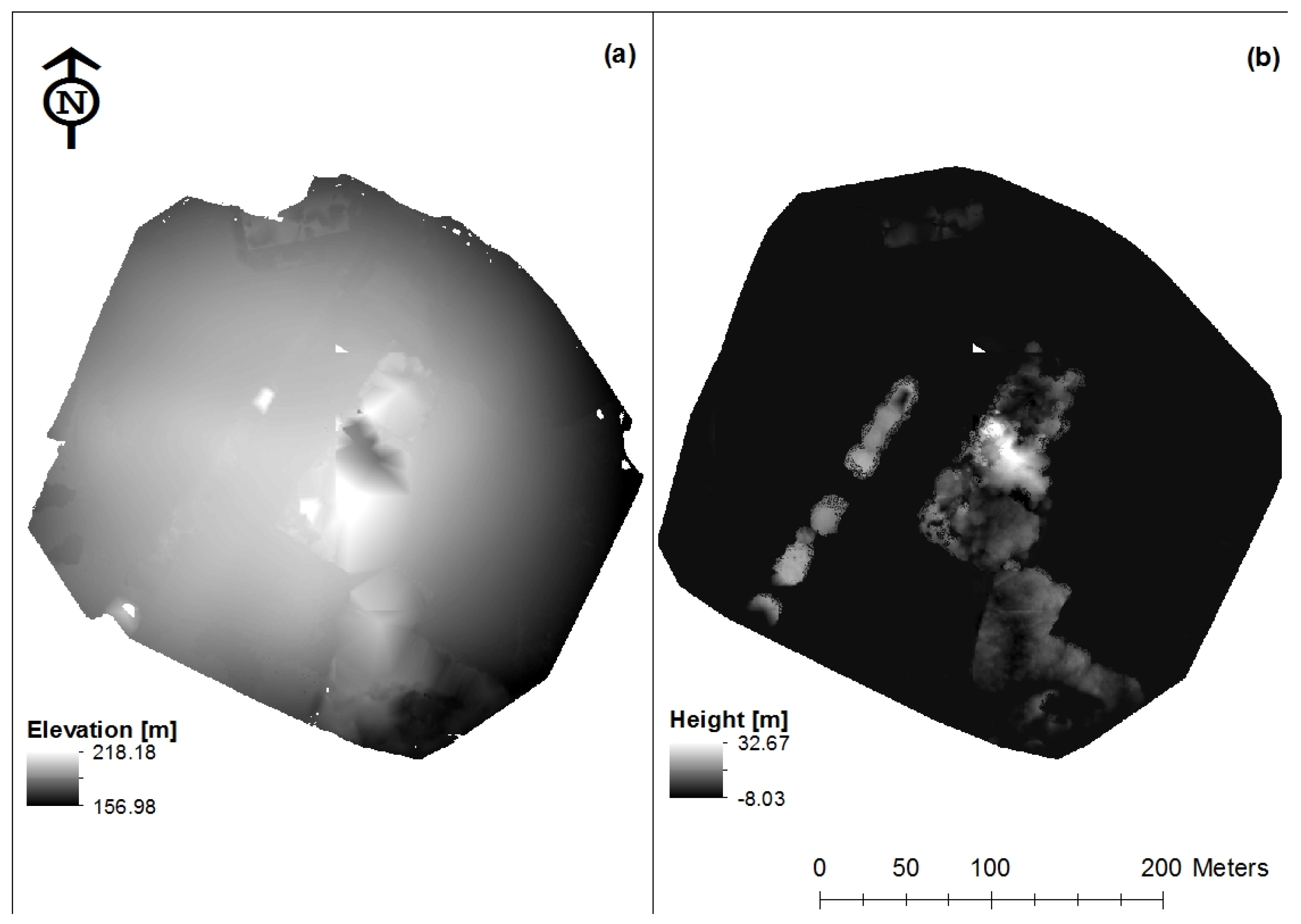 Showing (a) DEM and (b) CHM for the Dryden site generated by SfM. In (a) the ground elevation in canopy regions is significantly higher than that in bare regions due to lack of canopy penetration by SfM.