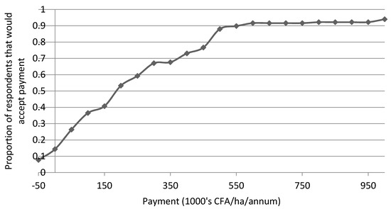 Figure 2 shows the proportion of respondents that indicated they would be willing to accept a bid amount for each bid level. Results indicate an acceptance rate of greater than 50 percent if compensation value was approximately greater than or equal to 200,000 CFA/ha/annum. The mean WTA was 226,047 CFA/ha/annum, while the median value was 222,416 CFA/ha/annum. At higher bid values, the curve becomes flatter indicating that a relatively small percentage of the respondents (i.e., approximately 10%) required bids of between 500,000 and 1,000,000 CFA/ha/annum to accept the contract.