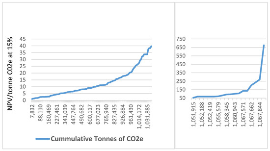 One striking finding is the degree of heterogeneity among values of land to households. The CV approach leads to a diverse range of acceptance for forest carbon conservation. The sample is split roughly into three groups: individuals willing to participate for no compensation, the majority of the sample willing to participate given some compensation, and individuals not willing to participate in the program, or only willing at extremely high levels of compensation relative to the rest of the sample. In the first group, 10% of the sample required no payment, perhaps because they saw the contract as a means of securing tenure to their land. However, there was also 5% of the sample that would not accept any offered amount to accept the contract. Nonetheless, the carbon abatement costs Figure 3) suggests a clear population subset that is willing to enter the proposed deforestation mitigation contract for a relatively low payment. Policy makers would be able to prevent nearly half of the available carbon stock (i.e., approximately 5,000,000 t CO2e ) from being emitted for a 10-year period for approximately 8 USD/t CO2e CO2, considering an interest rate of 15%.