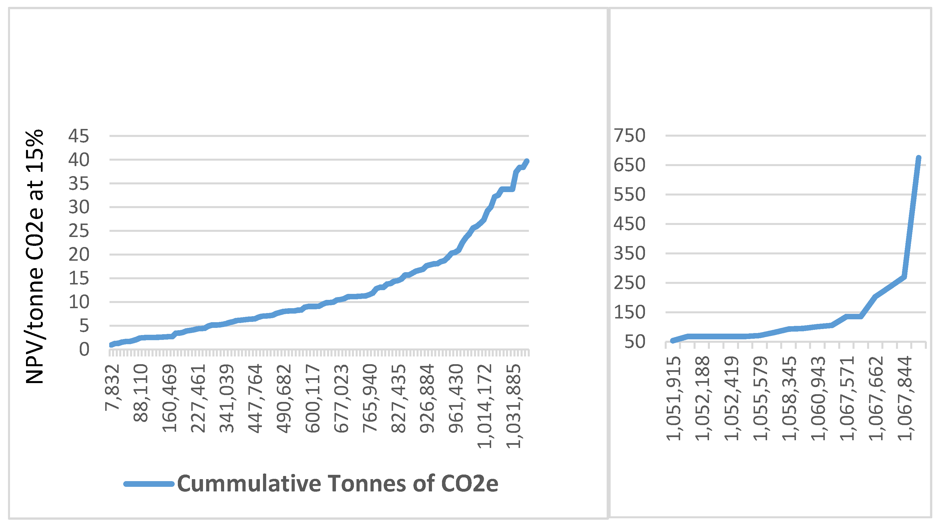 Figure 3 shows marginal costs of carbon abatement for various amounts of carbon derived from conserving areas of land. Due to missing data for some households, this supply curve is based on 135 the possible 169 households. We estimate that the amount of carbon held in fallows by those households equates to about one million tonnes of CO2e. Across the 135 households, the mean net present value of ten annual payments of the WTA is USD 29.94/t CO2e at a 15% discount rate and USD 55.67/t CO2e at a 0.01% discount rate. However, accounting for the sizes of the fallow areas on each of the 135 farms, the weighted mean net present value of the ten annual payments was USD 11.32/t CO2e at a 15% discount rate and USD 29.94 / t CO2e at a 0.01% discount rate, implying that households with larger areas had lower WTAs. However, the shape of the curve (Figure 3), assuming the 15% discount rate indicates that farmers would be willing to conserve 61% of the standing carbon stock for payments equating to a net present value of less than 10 USD/t CO2.e. Lower payments would still attract considerable interest from area farmers. For example, about 27% of the carbon could be conserved for less than payments equating to a net present value of less than 5 USD / t CO2e. At the other extreme end of the figure, the 18 highest observations of costs per tonne, which range from USD 55 to 675/t CO2e, in the right hand panel of Figure 3, add up to less than 2% of the carbon stock.