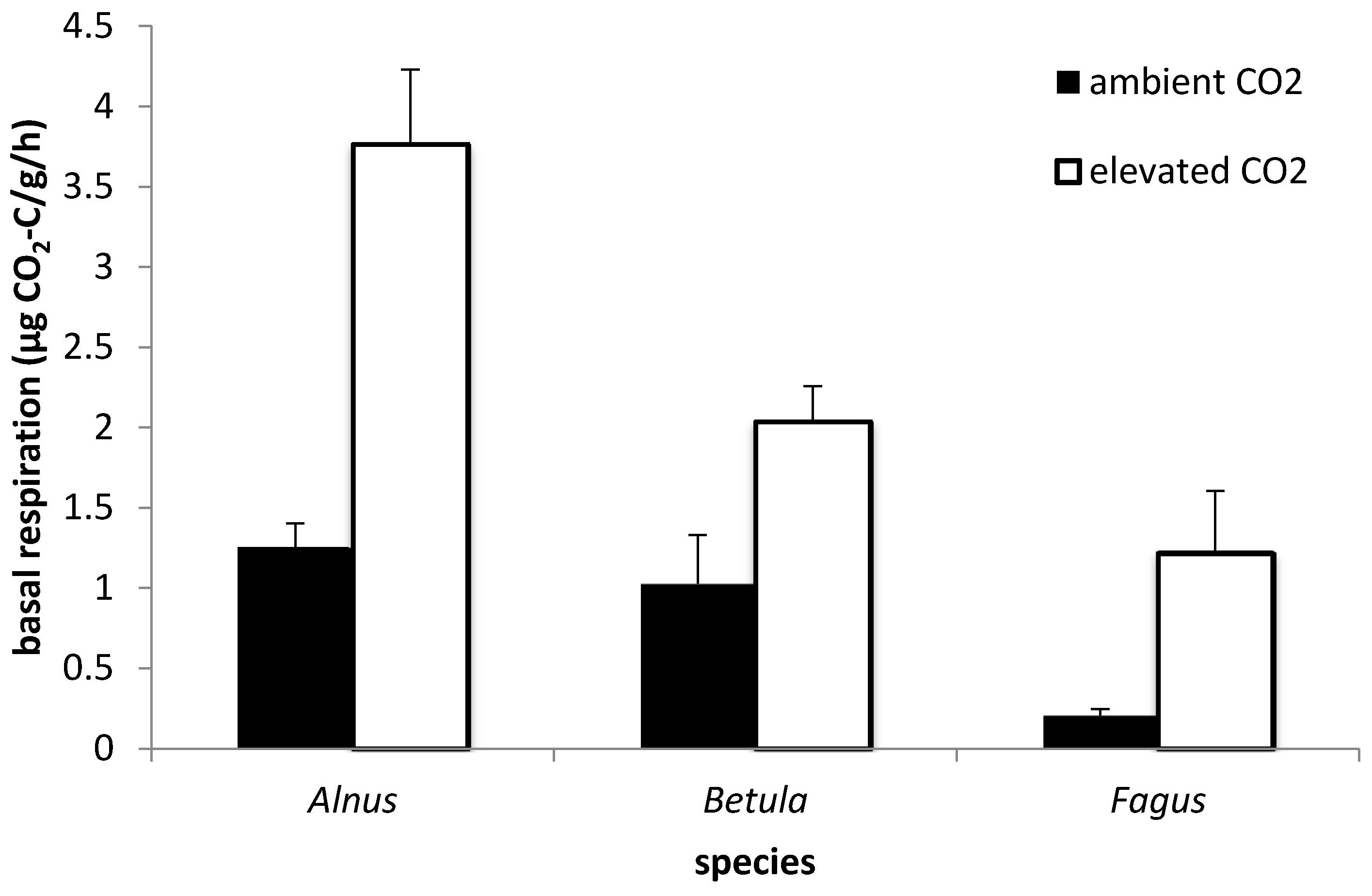 Interaction (p = 0.036) plot for CO2 regime and litter species (A. glutinosa, F. sylvatica and B. pendula) for respiration in earthworm casts at day 18 of incubation. Error bars represent standard errors (n = 4).