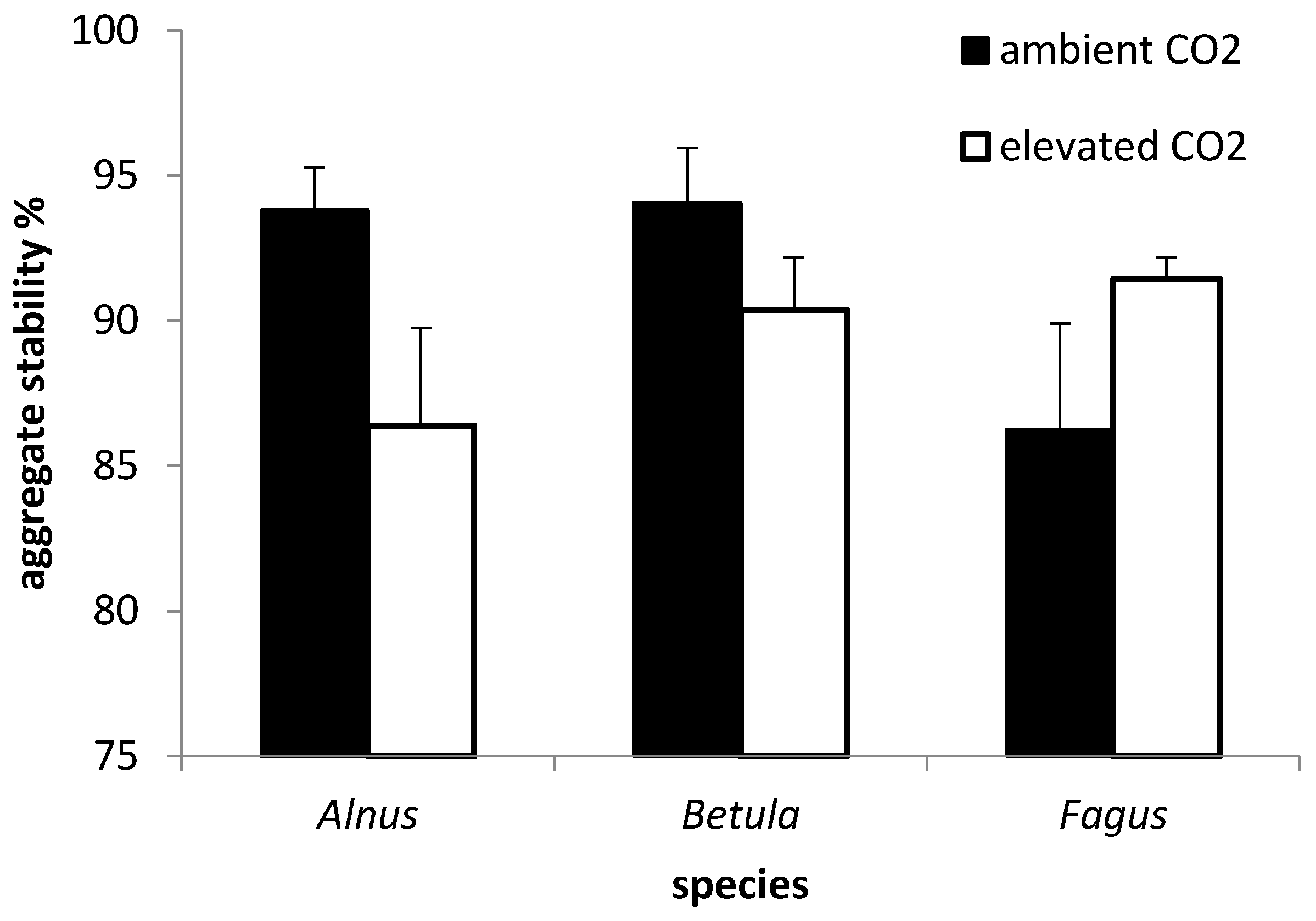 Interaction (p = 0.046) plot for CO2 regime and litter species (A. glutinosa, B. pendula and F. sylvatica) for stable aggregation—field experiment. Error bars represent standard errors (n = 4).