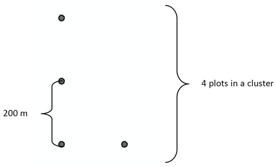 In this study, the sample design was adjusted for the available data using forest type information from an existing stand database and deriving development class information directly from ALS heights instead of the stand database. The initial number of forest types in the study area was 18. The initial forest type classification is based on main species and fertility. The forest types were grouped in seven classes: three pine classes with different fertility, three spruce classes with different fertility, and one deciduous species group. The cluster design was adjusted from nine plots per cluster used in Finland to four plots per cluster because of the relatively small and scattered inventory area. Distance between the plots was set to 200 m as a compromise between avoiding spatial autocorrelation and minimizing field data acquisition costs. Plots within a cluster are in “L” shape, see Figure 2. The field plot size was set to 9 m fixed radius circular plot, which is the same as used in Finnish Forest Centre’s sampling.