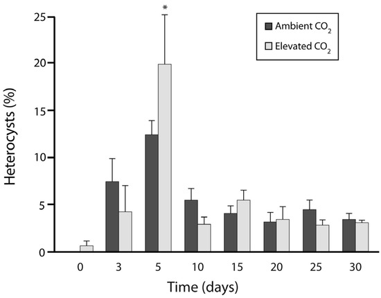 Percent of nitrogen fixing heterocyst cells in cyanobacterial cultures of N. punctiforme over 30 days. Samples were grown on 27 mm diameter agar vials under ambient (430 ppm) and elevated (750 ppm) atmospheric CO2 conditions. All data are plotted as mean ± SD; pairwise differences are shown using an asterisk symbol (*).