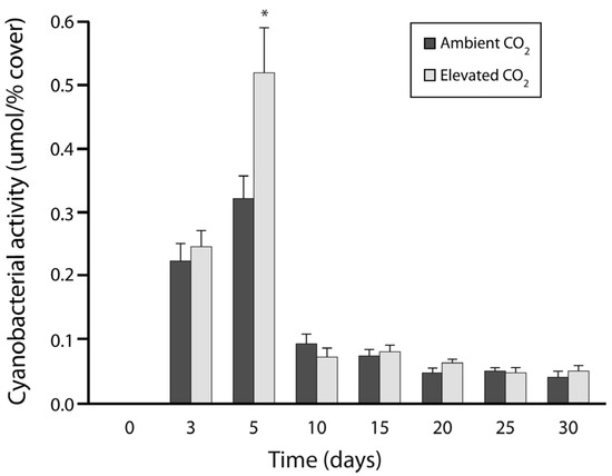Nitrogen fixation, as measured by ethylene production, did not differ between ambient CO2 and elevated CO2 treatments (F1,10 = 2.04, p = 0.184), although N fixation increased throughout time (F7,70 = 64.74, p < 0.001). No significant interaction effect of CO2 × time was detected (F7,70 = 0.93, p = 0.487). At all sampling times between 0 and 10 d, average N fixation rates were consistently low (below 0.64 μmol·vial−1), with an increase between day 10 and day 20 (Figure 1). Nitrogen fixation and cyanobacterial cover were strongly and positively correlated at all time points, with R values ranging between 0.58 and 0.85 (Pearson’s Correlation: p ≤ 0.05 for all data).