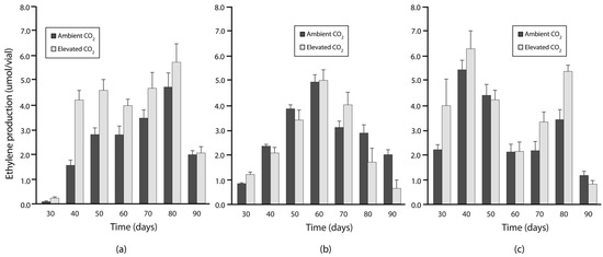 Nitrogen fixation of axenic N. punctiforme as measured by the ethylene (C2H4) produced over 90 days. Vials were grown at (a) 11.5 °C showing maximum N2 fixation at day 80; (b) 15.5 °C showing maximum N fixation at day 60; (c) 19.5 °C showing maximum N2 fixation at day 40 and day 80. All data are plotted as mean ± SD.